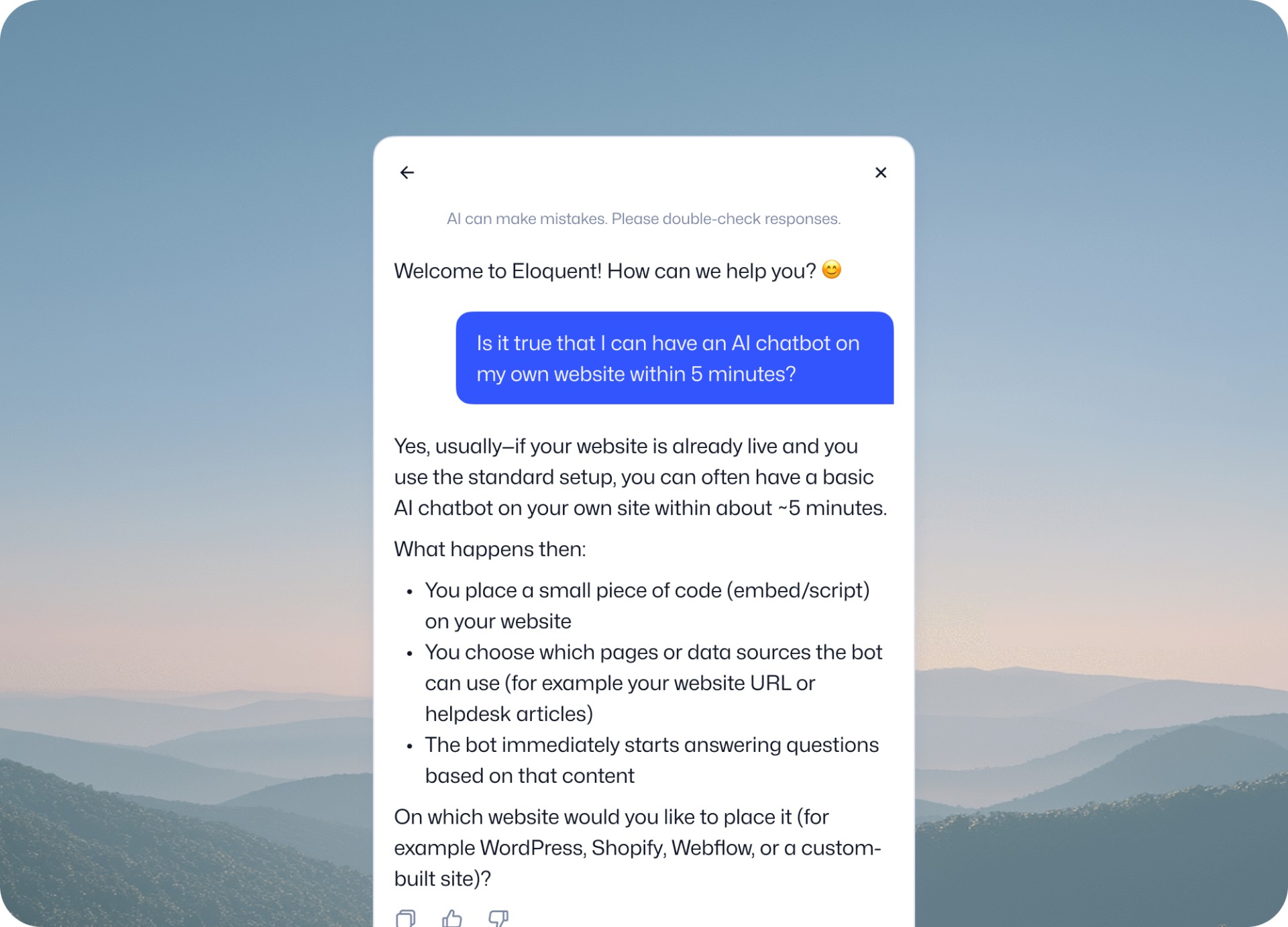 Connect your website, documents, and additional data sources in just a few steps. Eloquent keeps everything in sync, continuously updating your AI Chatbot with the latest information, so every response is accurate, consistent, and grounded in your own content.
